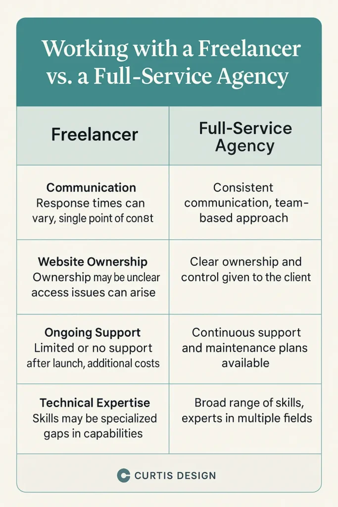 Now, let’s be honest — everyone knows someone who “has a cousin that does websites.” Freelancers are everywhere. Some of them are talented, no doubt. But when your site breaks, your cousin’s probably not picking up the phone. There’s no real structure, no accountability, and often, no long-term support.